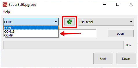 Кнопка “Boot” переводит устройство в режим подготовки к загрузке прошивки, после её нажатия изменится номер COM-порта устройства. Необходимо обновить информацию зелёной кнопкой обновления списка портов и выставить новое значение актуального COM-порта.