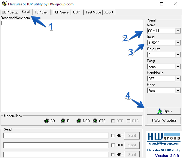 Теперь необходимо открыть com-порт для подключения сканера, в нашем примере мы используем программу Hercules. (рис.6)
