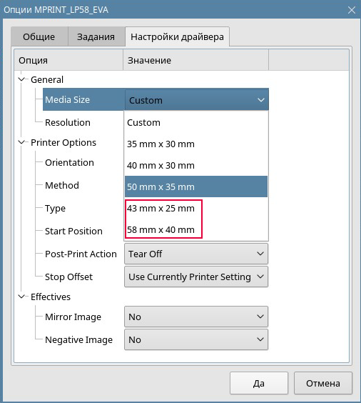 Если в списке нет нужного размера этикетки, добавьте его вручную. Например, для принтера MERTECH LP58 EVA в список доступных размеров добавим этикетки 43×25 мм и 58×40 мм: