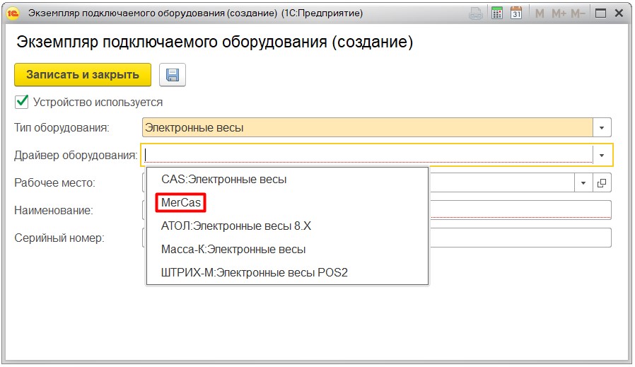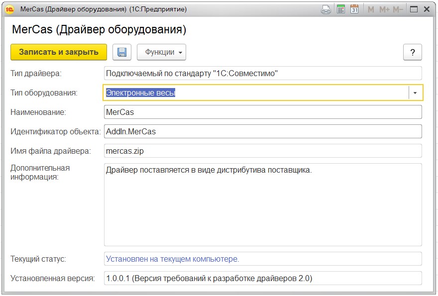 При создании драйвер необходимо корректно заполнить поле «Идентификатор объекта» как показано на рисунке: AddIn.MerCas.