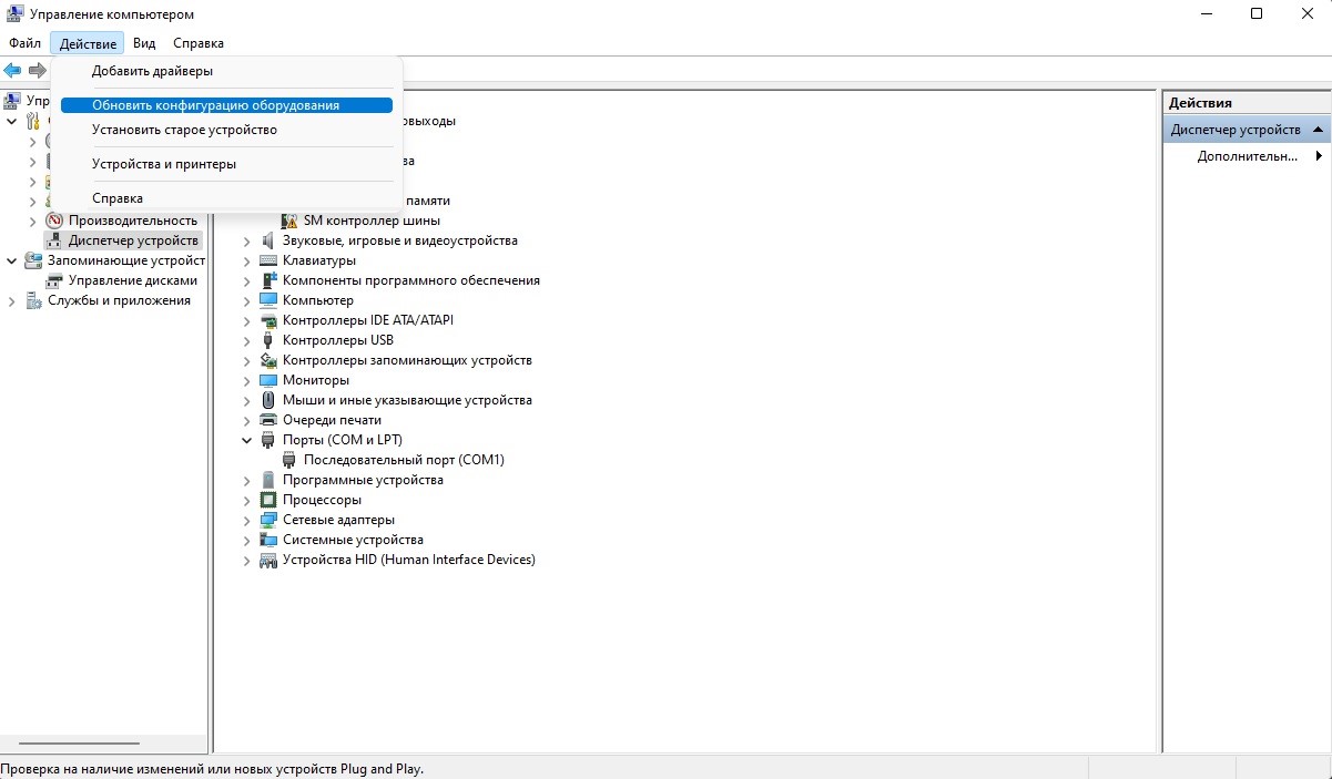 3. После установки драйвера через пункт «Действие» выполнить «Обновить конфигурацию оборудования» в диспетчере устройств Windows 11.