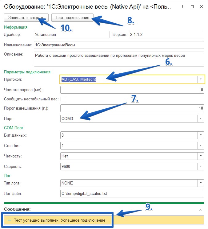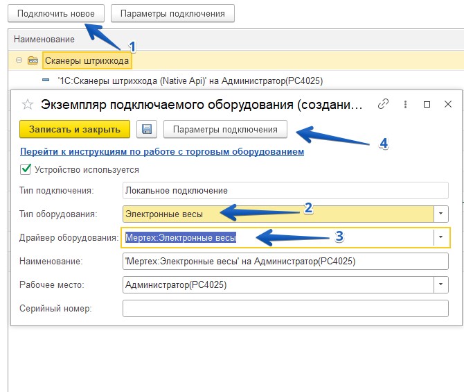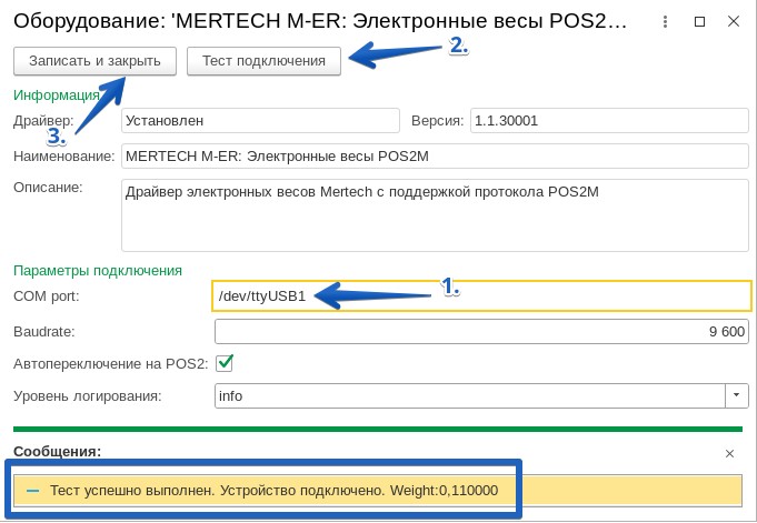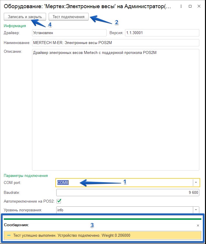 Нажмите кнопку Записать и закрыть для сохранения параметров подключения электронных весов.