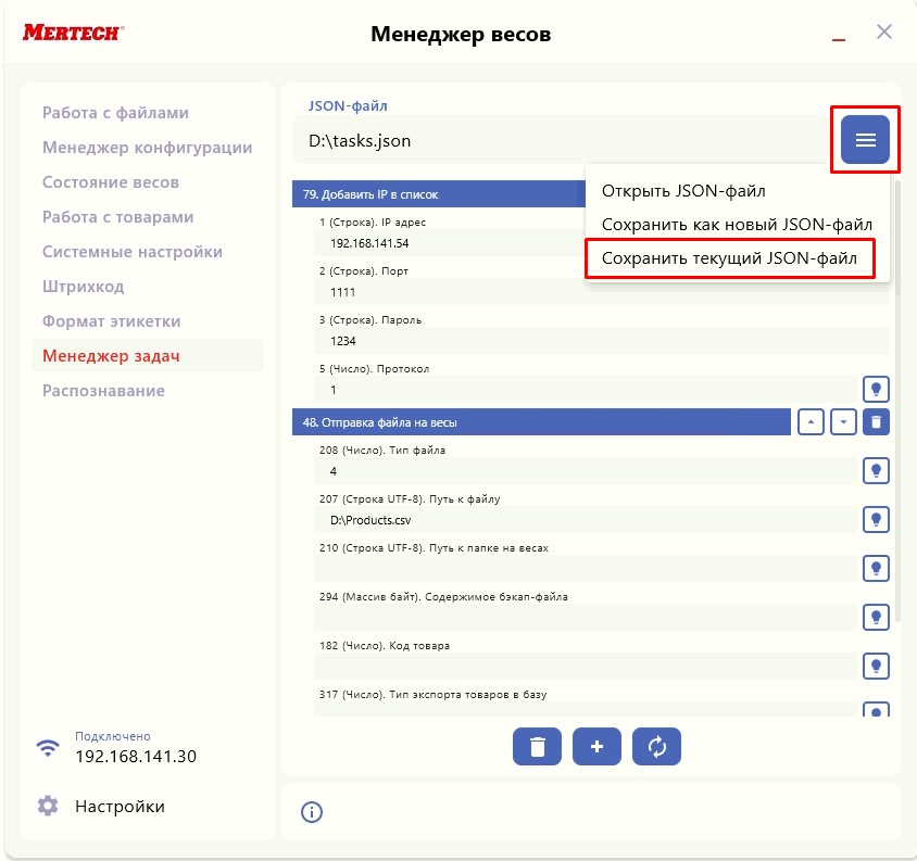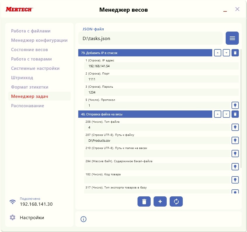 В менеджере весов необходимо создать файл json с необходимыми задачами: