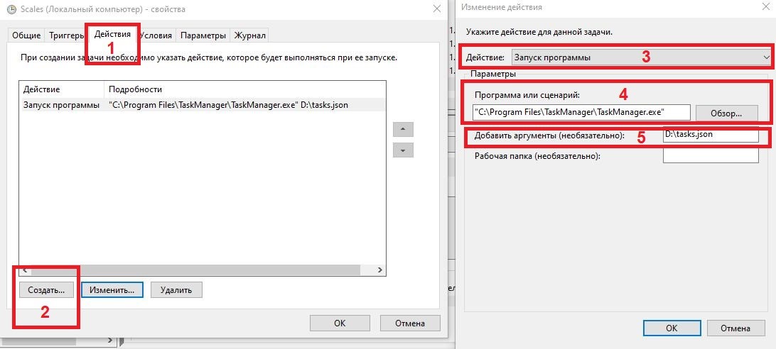 «В Добавить аргументы указывается путь к json-файлу с задачами. В параметр Рабочая папка указывается путь к json-файлу, куда будут записываться значения получаемые с весов. Второй параметр не обязателен, лишь на случай команд, в которых нужно получать информацию.»