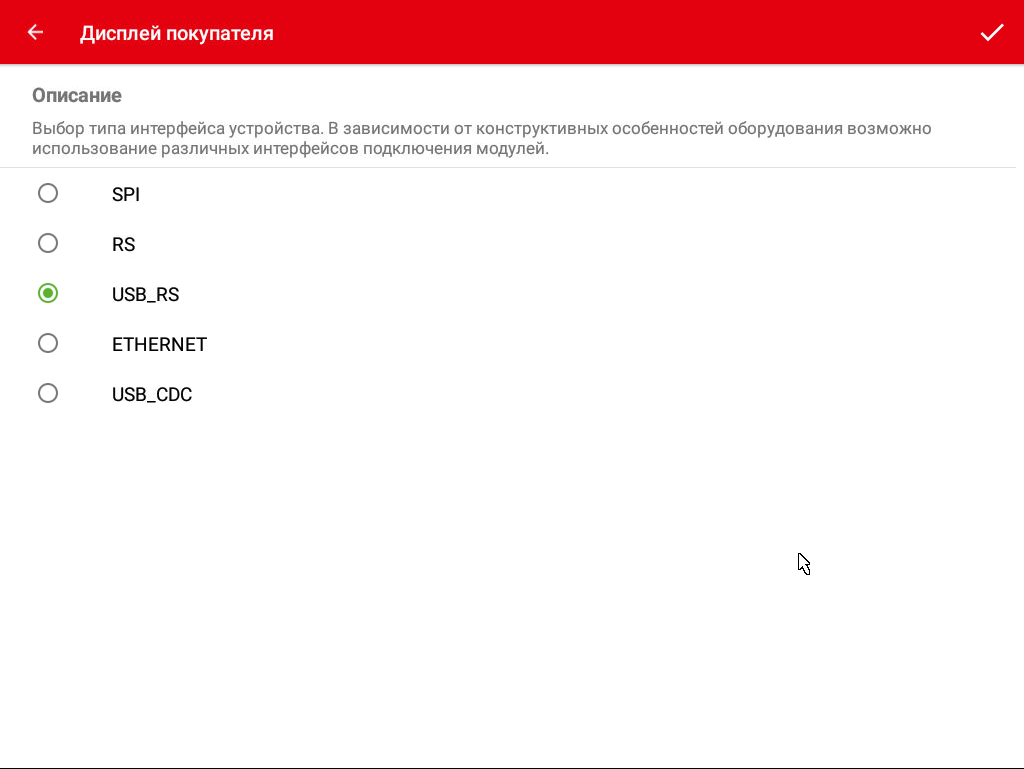 Тип подключения - окно с выбором типа интерфейса подключения к весам.