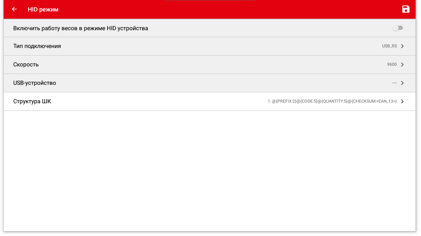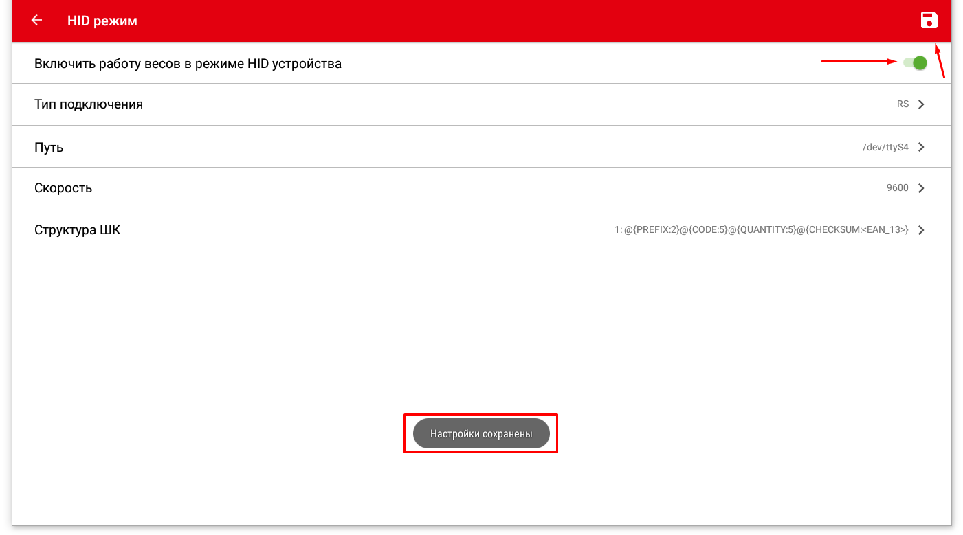 Далее необходимо включить работу весов в режиме HID устройства при помощи переключателя, для сохранения настроек нажмите на изображение дискеты в правом верхнем углу (рис.5).