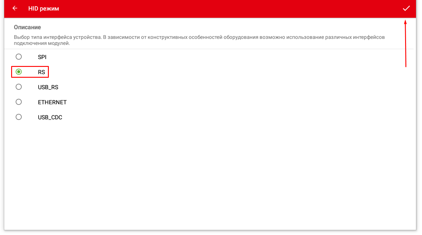 Перейдите в пункт «Тип подключения» и выберите RS, после чего нажмите на галку в правом верхнем углу (рис.3).