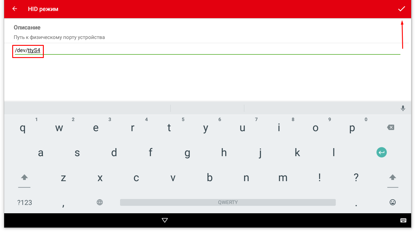При этом в основном меню «HID режим» появится пункт «Путь», в котором надо указать «/dev/ttyS4» с помощью экранной клавиатуры как показано на следующем рисунке (рис.4), для сохранения значения так же необходимо нажать на галку в правом верхнем углу.