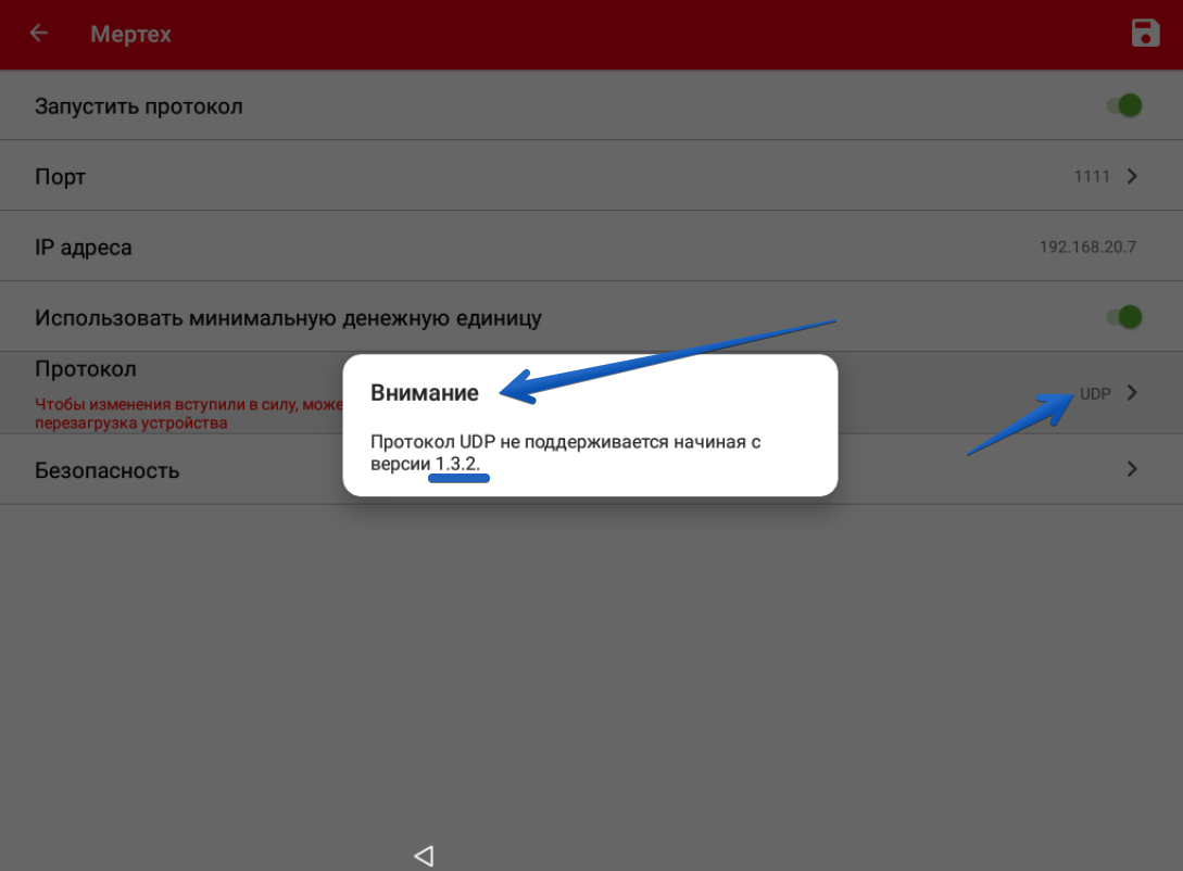 В приложении Service версии 1.3.2 и выше для весов Mertech M-ER с печатью этикеток опция переключения протокола обмена на UDP формально остаётся в интерфейсе, но при выборе отображается уведомление о том, что протокол UDP не поддерживается.