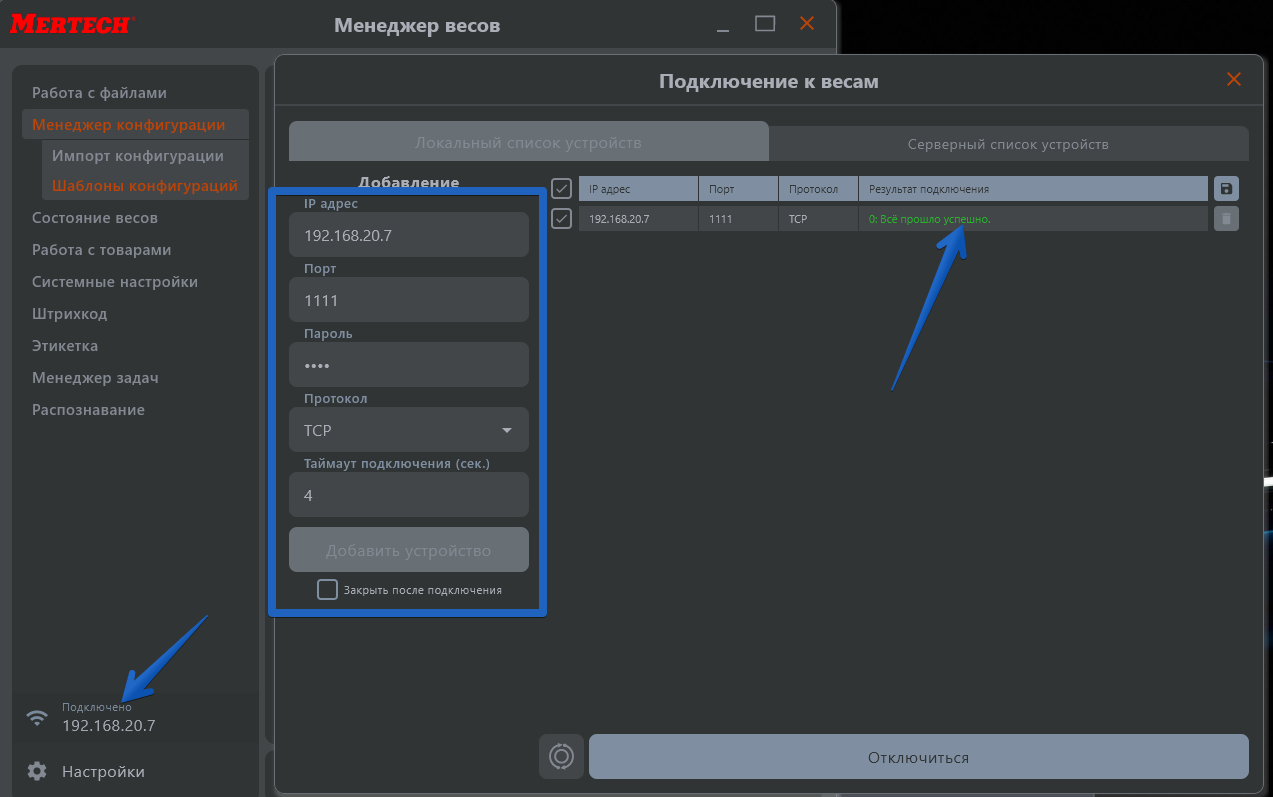 После выполнения всех вышеперечисленных действий весы перезагрузятся, а протокол изменится. Как следствие потеряется связь с менеджером весов, аналогично пункту 1 измените протокол на UDP и выполните повторное подключение.