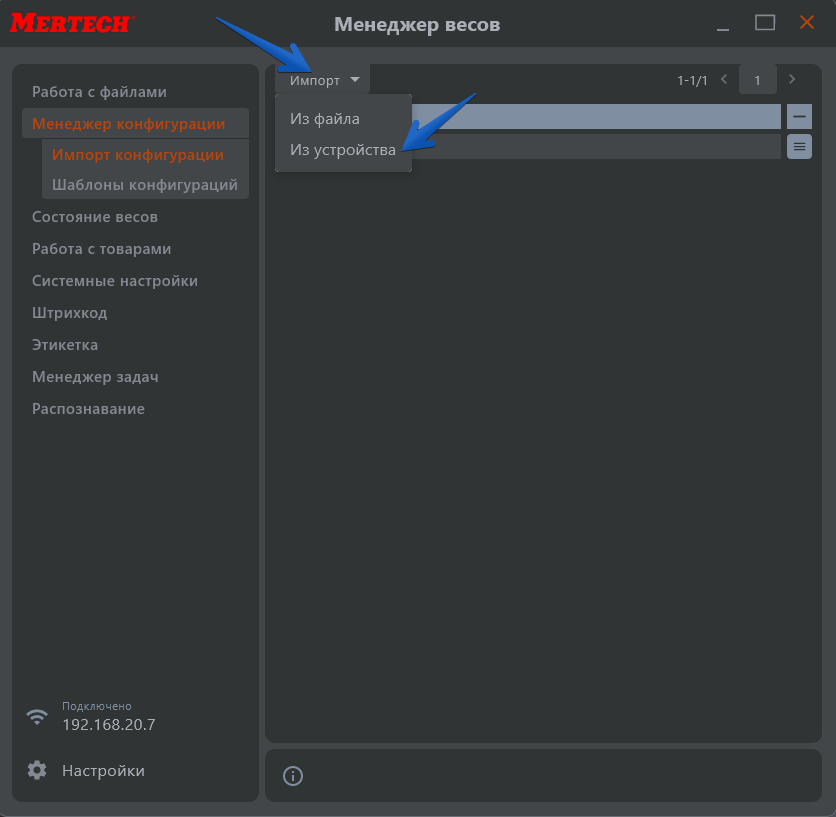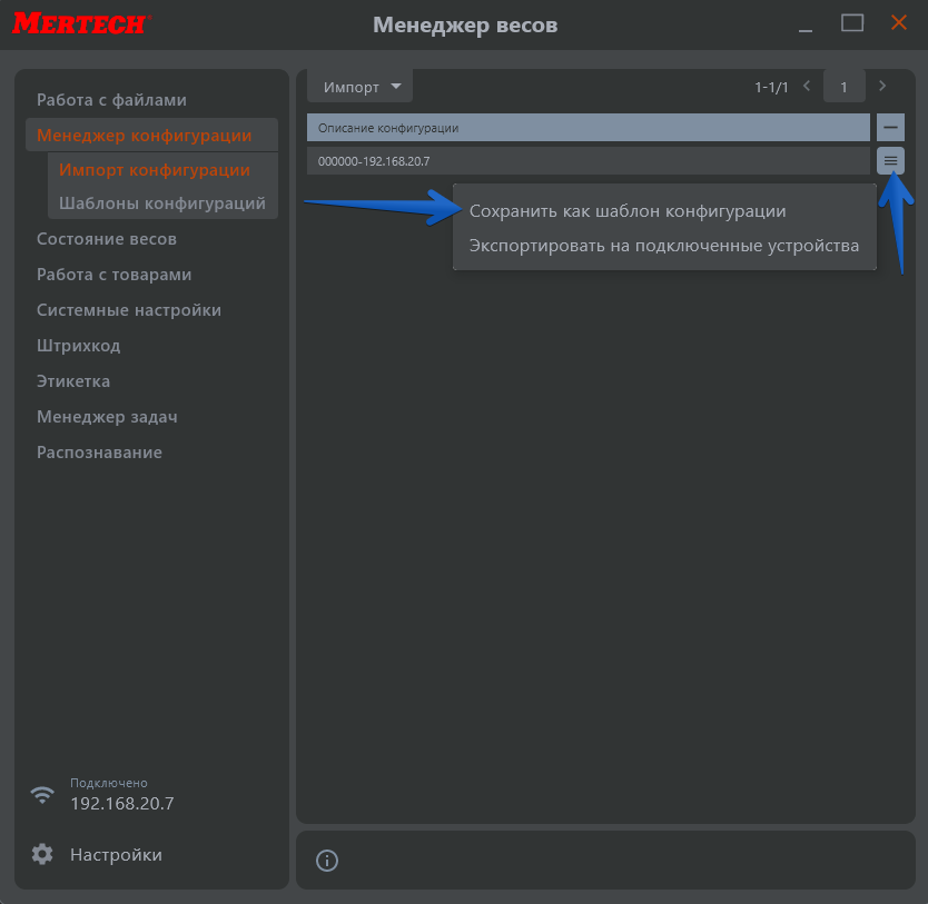После завершения процесса импорта конфигурации из устройства внизу окна появится уведомление о том, что все прошло успешно. Импортированная конфигурация отобразится в списке. Нажмите кнопку ≡ (дополнительно) и выберите пункт «Сохранить как шаблон конфигурации».