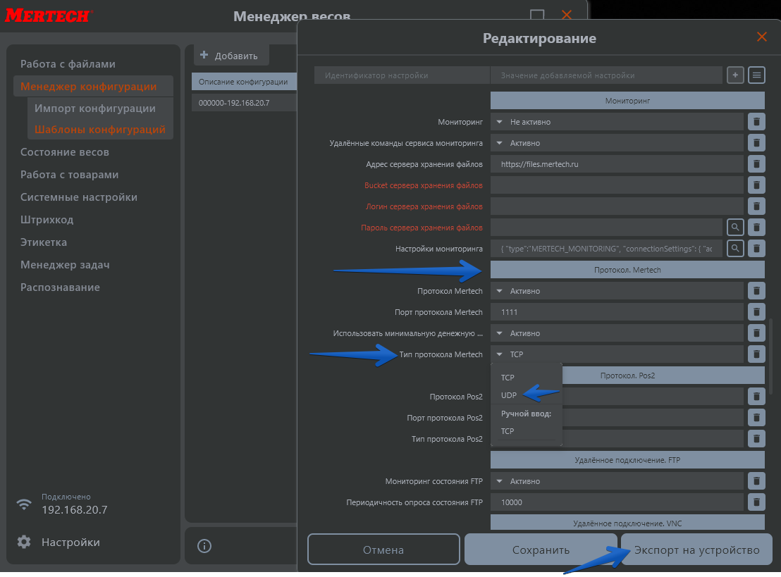 В появившемся меню «Редактирование» пролистайте вниз до раздела «Протокол Mertech» и измените параметр «Тип протокола Mertech» на UDP. Затем нажмите кнопку «Экспорт на устройство» в нижней части окна.