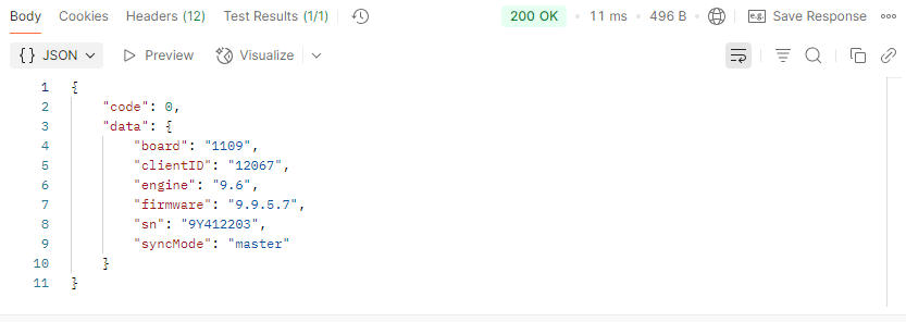 3. На данном этапе следует обратить внимание на строку «board», в данном случае значение «1109», это указывает на то, что данная плата поддерживает Rest Api v2. Если в ответе будет указанно «board»: “1808” - такая плата не поддерживает Rest Api v2, пример показан на рисунке 3.