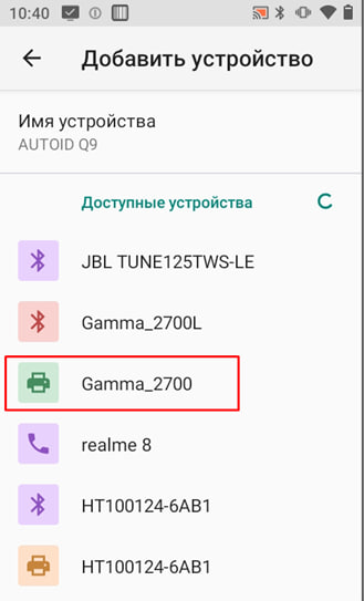 Установите сопряжение ТСД и принтера, для этого зайдите в настройки Bluetooth на ТСД и выберите пункт «добавить устройство». В появившемся списке выберите принтер «GAMMA» и введите пароль - «0000». Процесс добавления устройства изображен на рисунках 1-4.