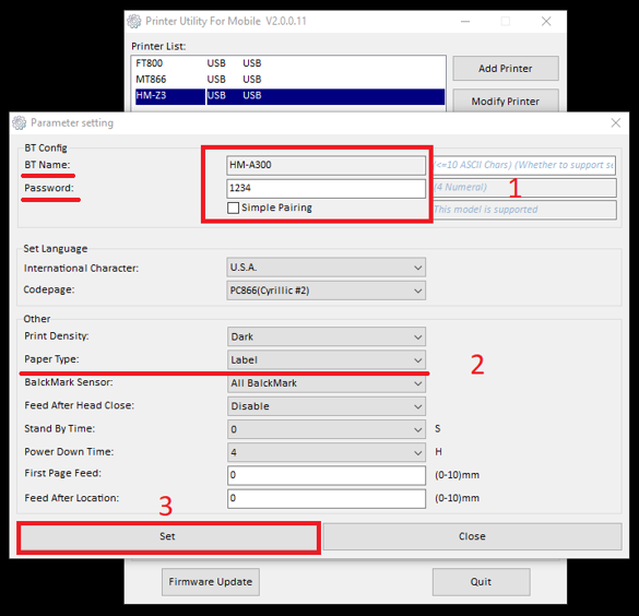 Перед подключением принтера HM-Z3 укажите его имя и пароль через настроечную утилиту, а также выберите тип используемой бумаги и нажмите «Set». По умолчанию имя принтера HM-A300, пароль 1234 (рис.1).