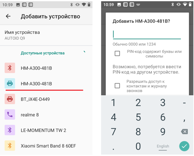 Принтер будет отображаться в доступных устройствах в формате HM-A300-XXXX. В нашем случае имя принтера HM-A300-481B, пароль 1234 (рис.3).