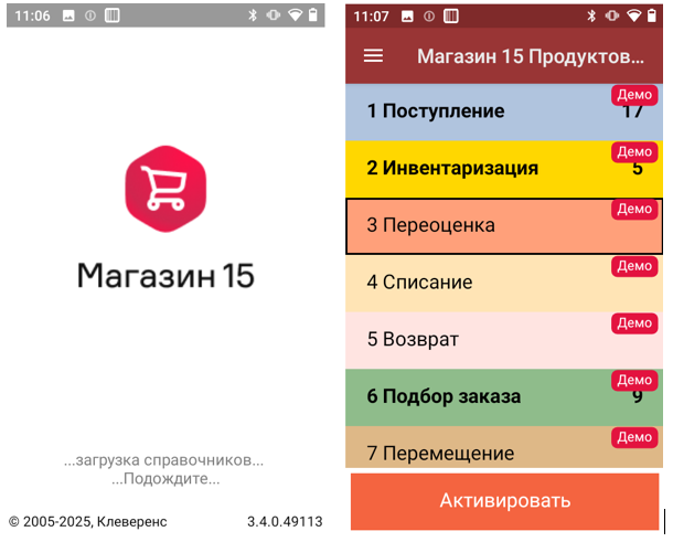 Перед началом работы необходимо установить приложение Склад 15 или Магазин 15.