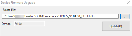 Для обновления принтера требуется файл с прошивкой TP805_V1.04.58_BETA1.dfu. Его нужно установить после обновления Ethernet-платы.