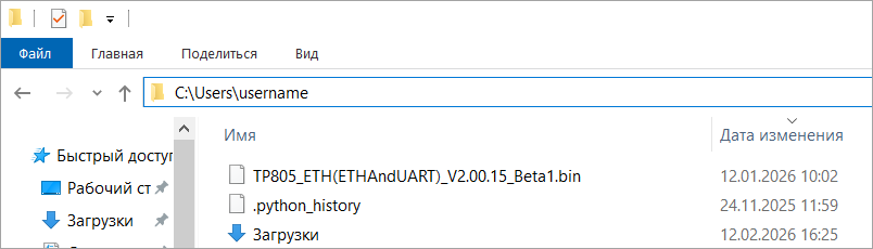 Перемеcтите файл прошивки TP805_ETH(ETHAndUART)_V2.00.15_Beta1.bin в папку «C:\Users\<пользователь>».