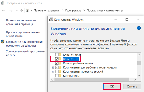 В окне Компоненnы Windows отметьте Клиент TFTP, нажмите ОК и дождитесь завершения настройки.