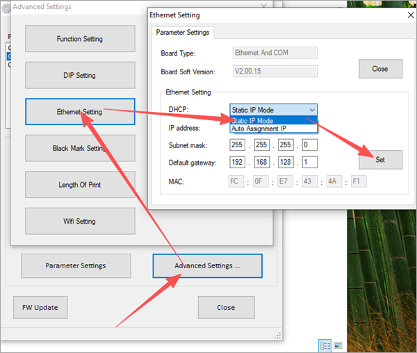 В блоке Ethernet Setting в поле DHCP выберите «Static IP Mode». Нажмите Set.