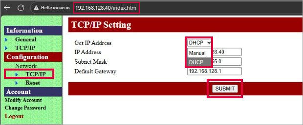 В поле Get IP Address измените «Manual» на «DHCP» и нажмите SUBMIT.