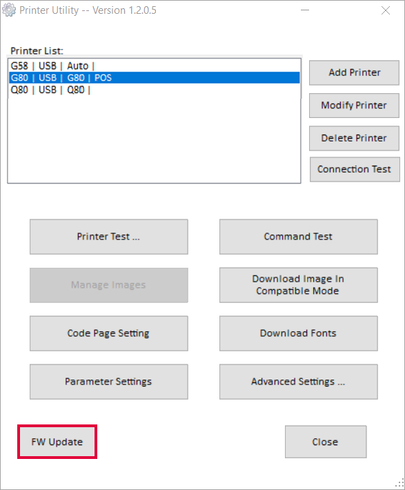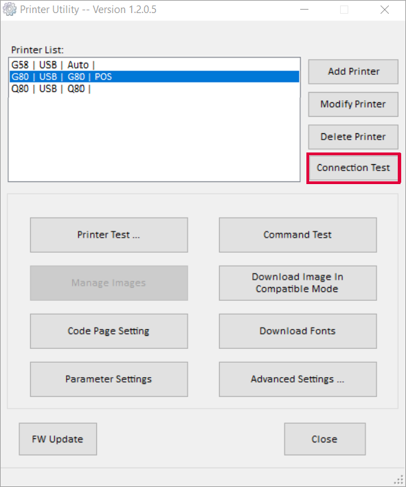 Откройте утилиту MPRINTUtility и проверьте соединение — выберите принтер и нажмите Connection Test.