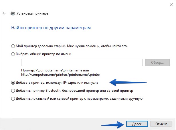 В окне установки принтера выберите Добавить принтер, используя IP-адрес или имя узла (рис.5).