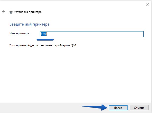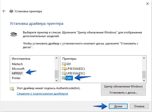 Установите драйвер принтера, для этого в Изготовитель выберите MPRINT -> Q80 и нажмите кнопку далее (рис.8).