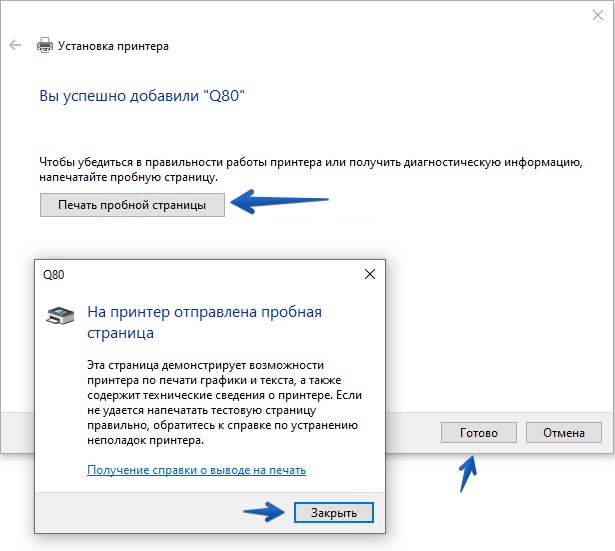 Чтобы проверить корректность подключения принтера, нажмите на кнопку Печать пробной страницы. На принтере должна распечататься «Пробная страница печати Windows». После чего можно закрыть окно с сообщением об отправке пробной страницы и нажать кнопку Готово (рис.11).