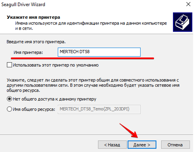 При необходимости введите другое имя принтера, назначьте принтером по умолчанию или предоставьте общий доступ по локальной сети и нажмите «Далее» (рис.9).