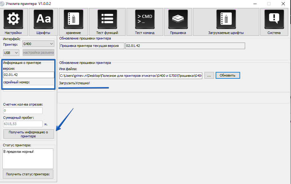 Проверьте какая версия прошивки установлена на Вашем принтере с помощью кнопки Получить информацию о принтере.