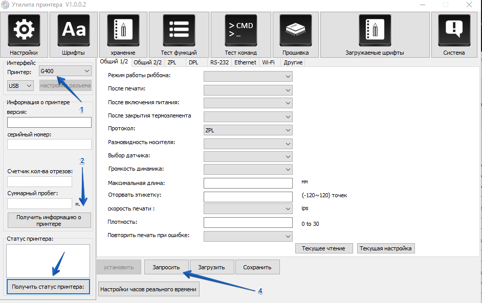 Получите информацию о том какие настройки установлены на принтере с помощью кнопки Запросить (рис.1)