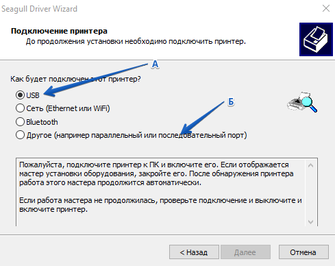 А - программа обнаружит подключенный принтер и предложит установить драйвер (рис.6); Б - «Другое» если принтер не обнаружен автоматически (рис.7).