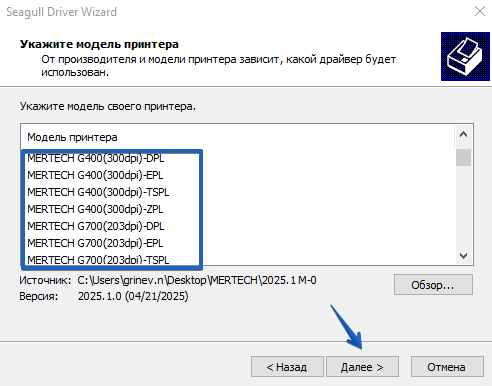 Выберете из списка Вашу модель принтера, разрешение и необходимый протокол печати.