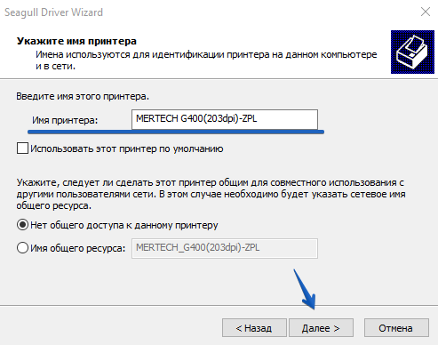 При необходимости введите другое имя принтера, назначьте принтером по умолчанию или предоставьте общий доступ по локальной сети и нажмите «Далее» (рис.9).
