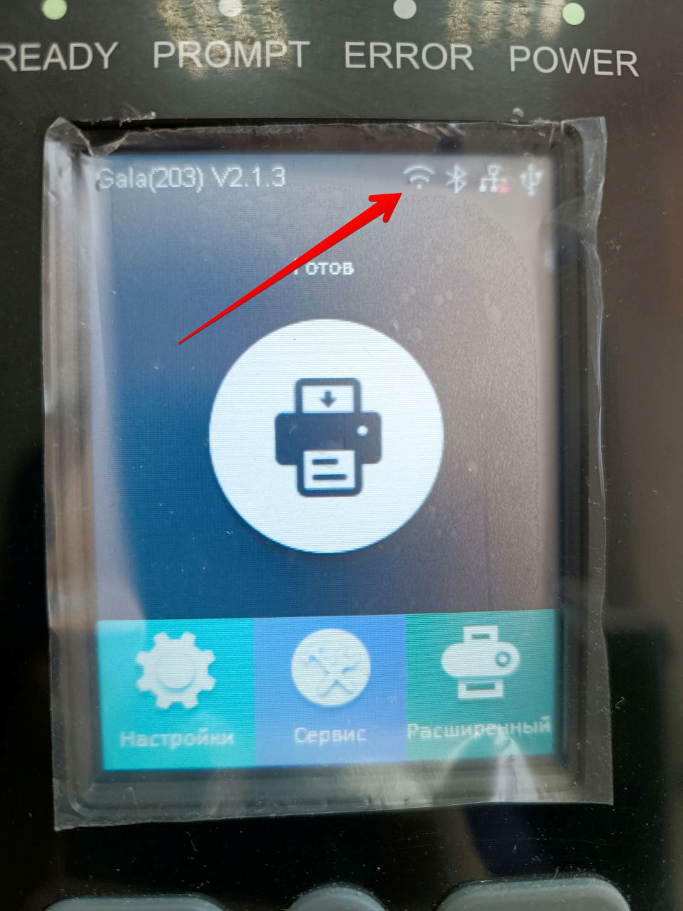 Если wi-fi модуль установлен правильно, то на экране принтера появится заначек работы wi-fi.