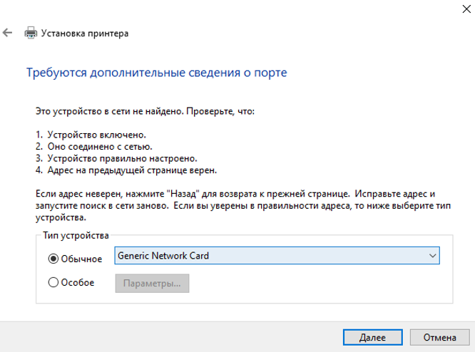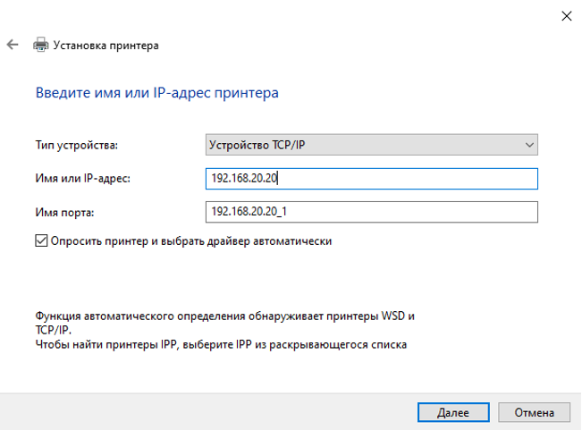 Введите IP-адрес принтера, нажмите «Далее».