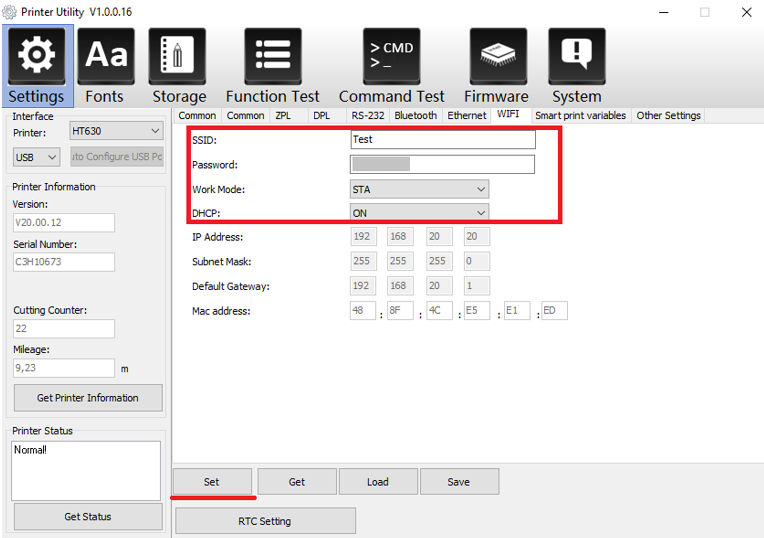 Введите параметры сети WIFI, выберите режим STA, включите DHCP и нажмите «SET». После применения настроек Ваш принтер получит IP адрес (рис.6).