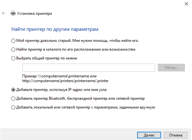 Выберите «Добавить принтер, используя IP-адрес или имя узла» и нажмите «Далее» (рис.9).