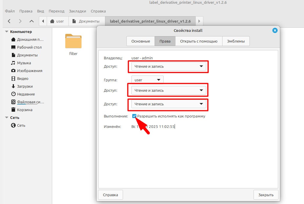 В открывшемся диалоговом окне, перейдите во вкладку Права. Далее изменить во всех пунктах Доступ, выбрав Чтение и запись и поставить галочку Разрешить исполнять как программу (рис.1).