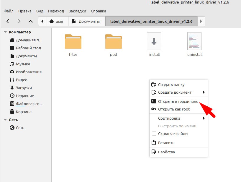 4. В этой же папке, на пустом месте нажмите правой кнопкой мыши и выперите пункт меню Открыть в терминале (рис.2).