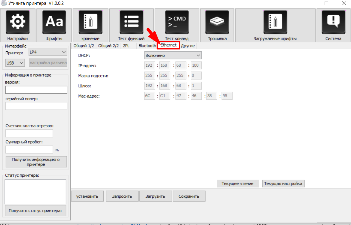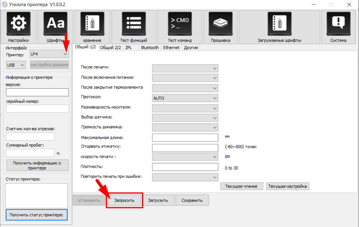 Выбрать модель LP4 и считать параметры принтера, нажав кнопку Запросить (рис.2).