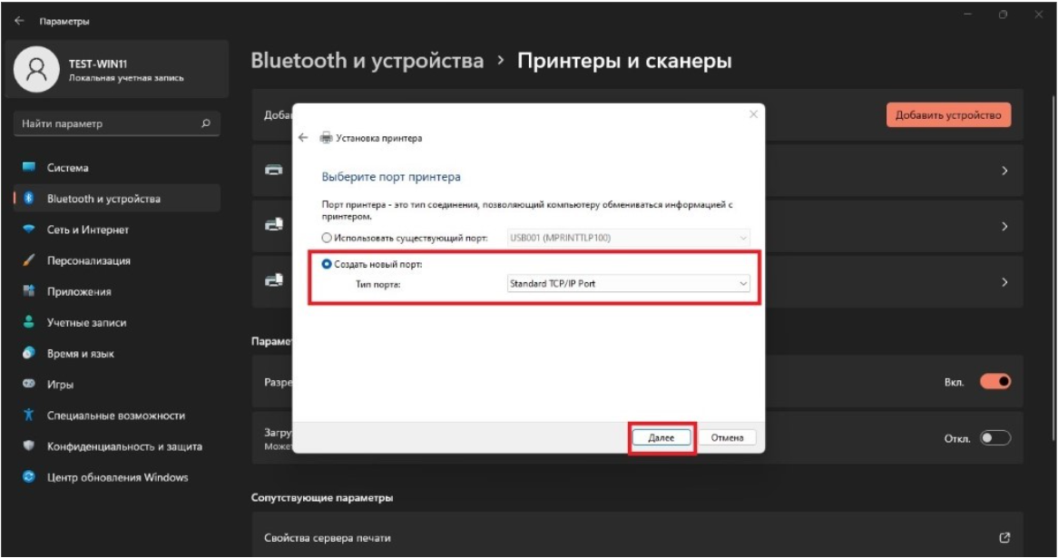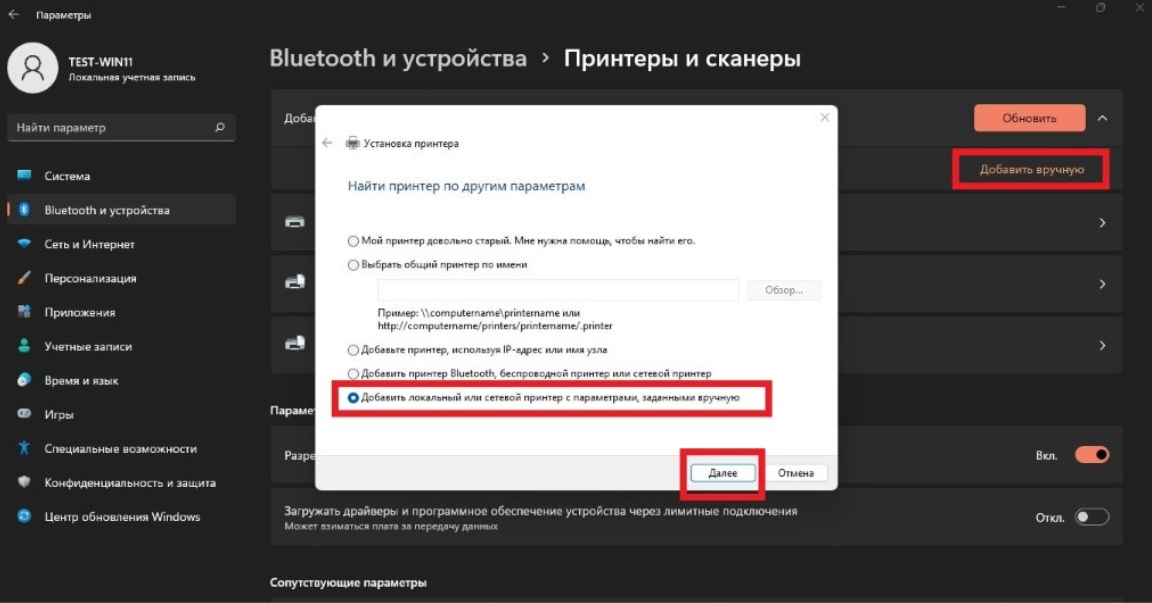 Добавить вручную –> Добавить локальный или сетевой принтер с параметрами, заданными вручную –> Далее.
