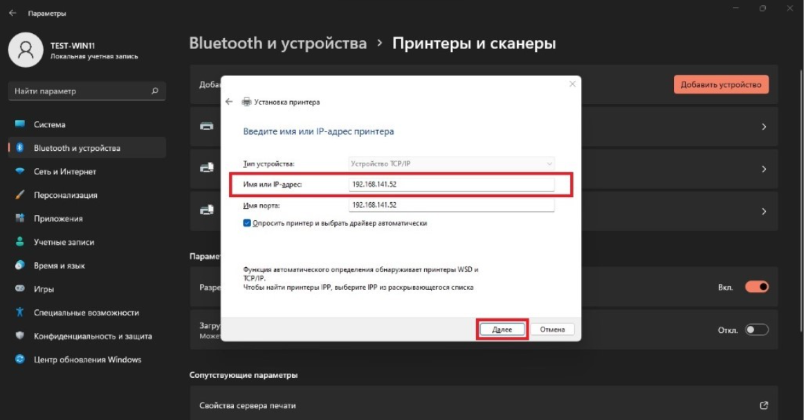 В поле Имя или IP-адрес ввести IP-адрес принтера, например в нашем случае принтер имеет IP-адрес 192.168.141.52, после ввода нажимаем кнопку «Далее». Некоторое время будет производиться поиск порта.