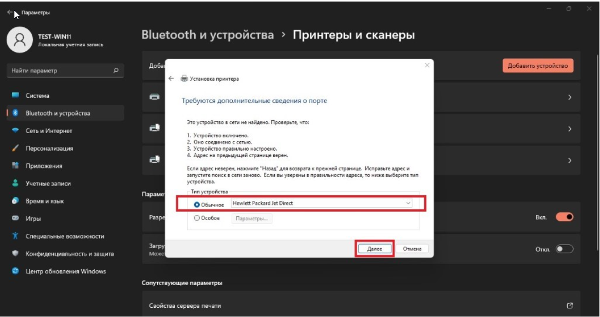 Тип устройства –> Обычное –> Hewlett Packard Jet Direct –> Далее.