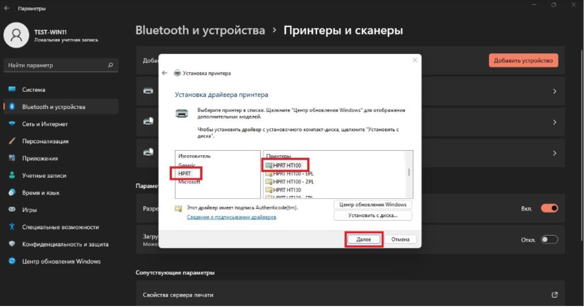 В поле «Изготовитель» выбрать HPRT, в поле «Принтеры» выбрать нужную модель, в нашем случае это HPRT HT100. Необходимо выбирать драйвер принтера без дополнительных пометок ZPL или EPL, это важно, иначе принтер будет печатать некорректно. После выбора нужного драйвера нужно нажать «Далее».