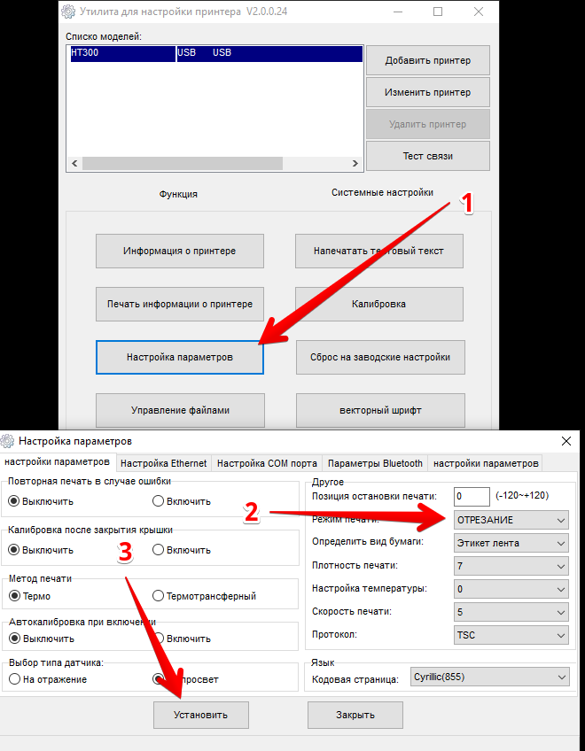 После установки отрезчика, необходимо скачать настроечную утилиту и в ней настроить режим работы принтера с отрезчиком: