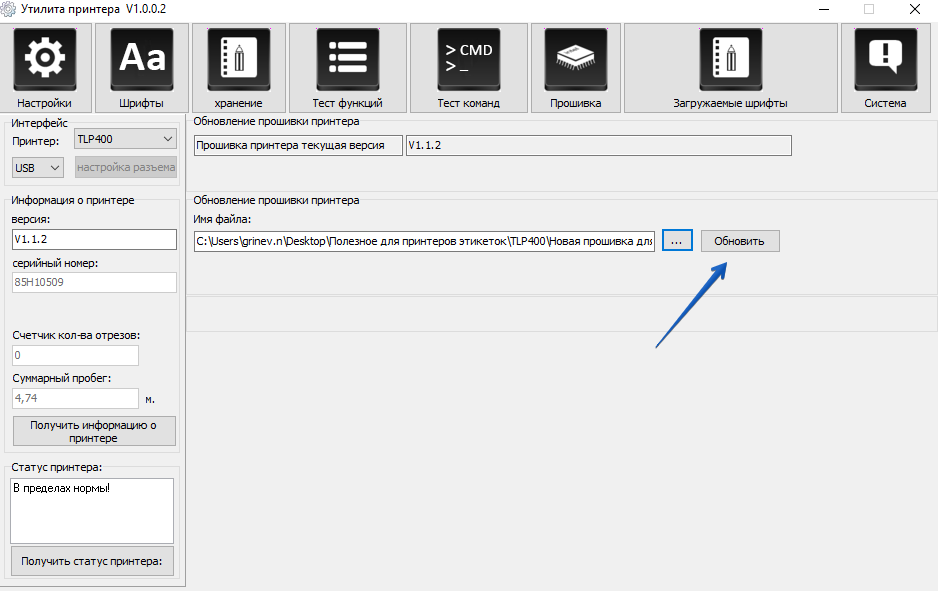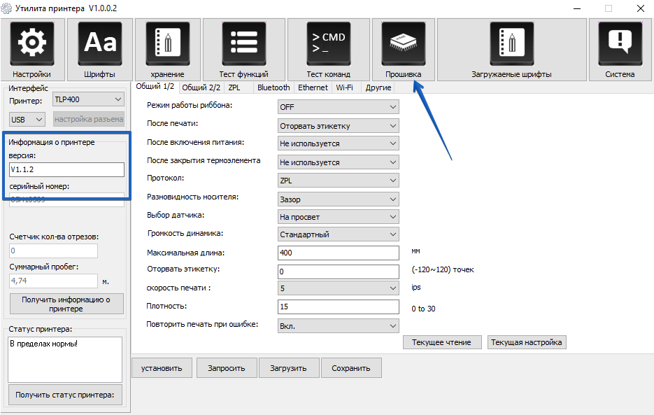Когда принтер перезагрузится, нажмите кнопку Получить информацию о принтере, версия прошивки изменилась. (рис.5)
