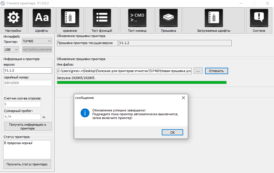 Обновление программного обеспечения принтера MERTECH TLP-400 завершено